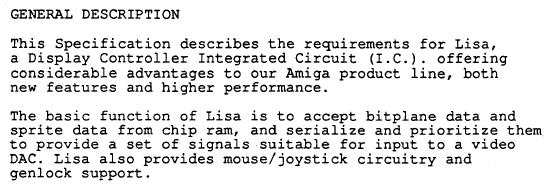 Erweiterte Beschreibung u.a. zu Signalen und Registern sind in der Commodore-Spezifikation zur Lisa abgelegt (s.u.).