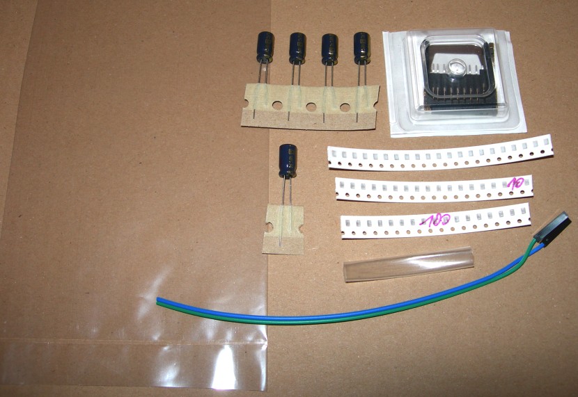 Durch mehrere Sammelbestellung hat sich bei mir dieses Vorgehensweise als sehr praktisch herausgestellt. Die verschiedenen SMD-Widerstände und -Kondensatoren und z.T. auch einige kleine aktive Bauelemente wie Transistoren und Dioden werden auf einen vordrucken Zettel mittels durchsichtigem Klebeband aufgeklebt. Wichtig dabei ist, das alle ! Bauteile irgendwie schon selbst eine Hülle haben. Der Klebstoff wäre sonst an den Lötstellen.