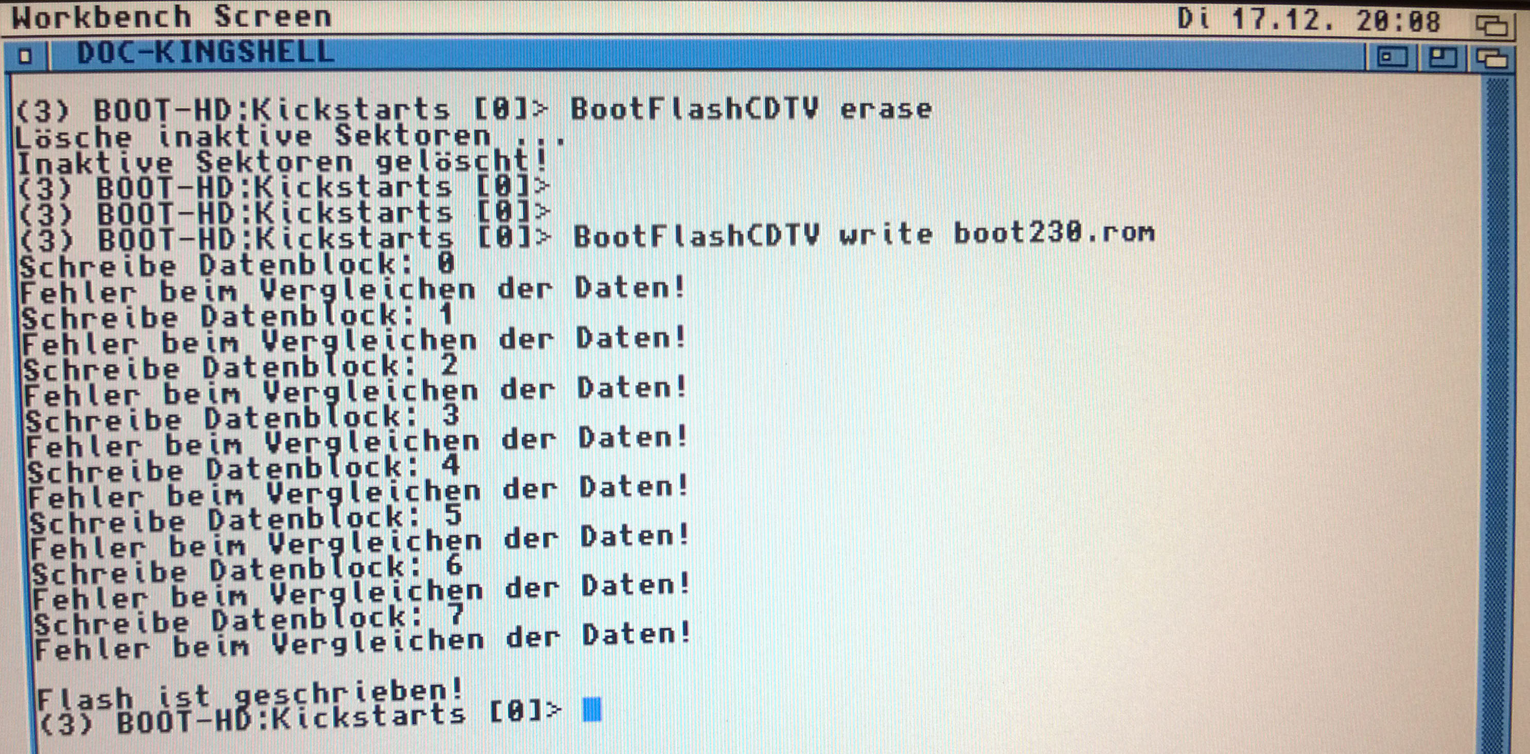 Das CDTV Boot-ROM unbedingt erst flashen, wenn das Kickstart erfolgreich geflashed wurde! Damit wisst ihr nämlich, daß das Modul funktioniert und das Boot-ROM auch ordnungsgemäß geflashed werden kann. Aus technischen Gründen ist eine Überprüfung dort nicht möglich.