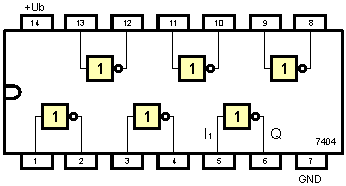 Dieser Baustein enthält sechs getrennte Nicht - Gatter (INVERTER). Alle sechs Gatter können unabhängig voneinander verwendet werden. Bei jedem Gatter nimmt der Ausgang Q den Zustand LOW an, wenn der Eingang I auf HIGH liegt. Ist der Eingang LOW, wird der Ausgang HIGH.