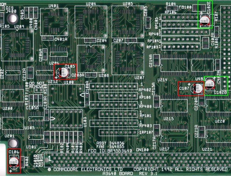 | Achtung! Drei der Elektrolyt-Kondensatoren sind oft verpolt von Commodore aufgelötet worden ! Bei einigen Boards ist zudem der Bestückungsdruck falsch (im Bild die rot umrandeten Elkos)! |